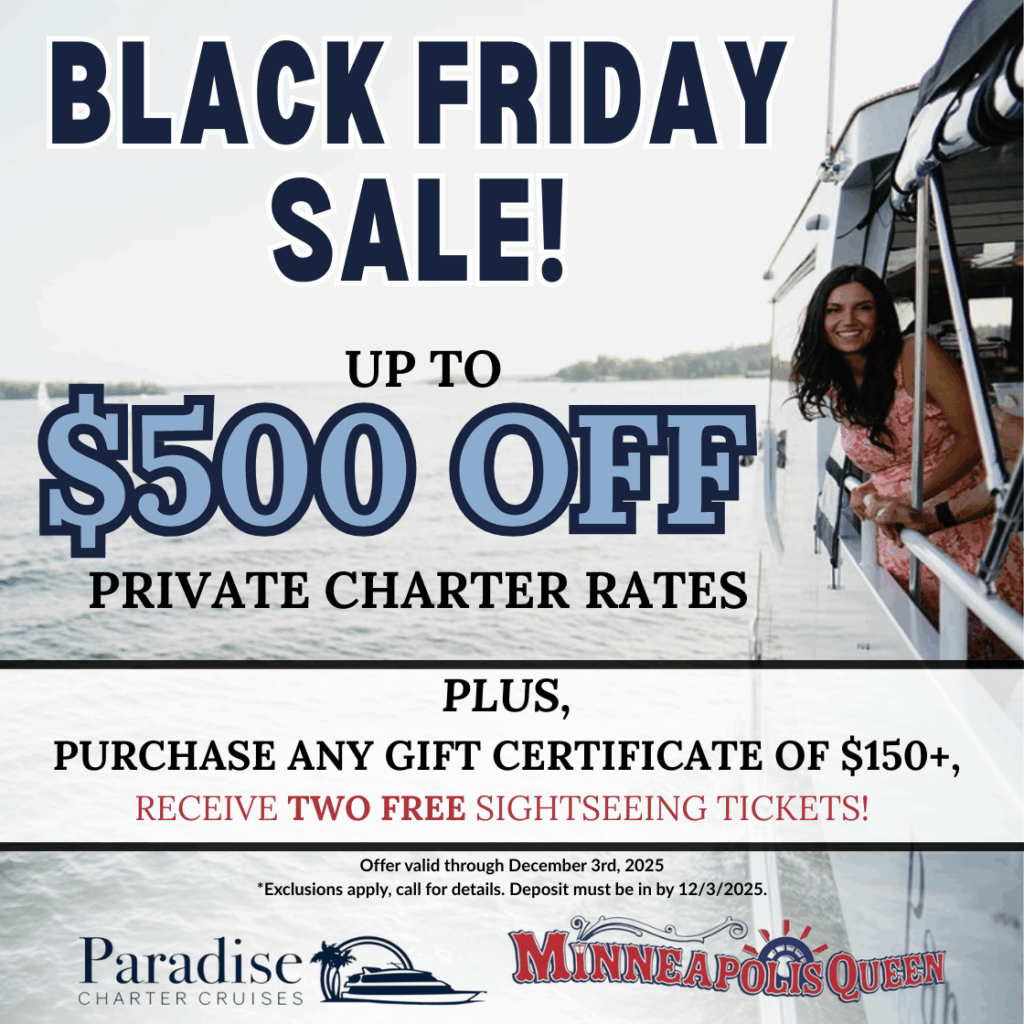 Our Black Friday cruise deals are available only once a year! Get ready to reserve your perfect escape aboard Paradise Charter Cruises and The Minneapolis Queen today.