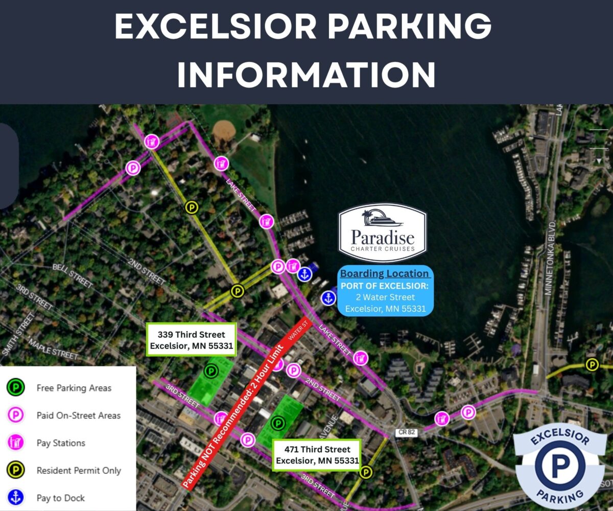 Ample FREE parking is available behind the shops between 2nd and 3rd Streets off of Water Street in beautiful downtown Excelsior and just a short walk to our dock. Look for the Blue and Green Parking Signs as you drive down Water Street.