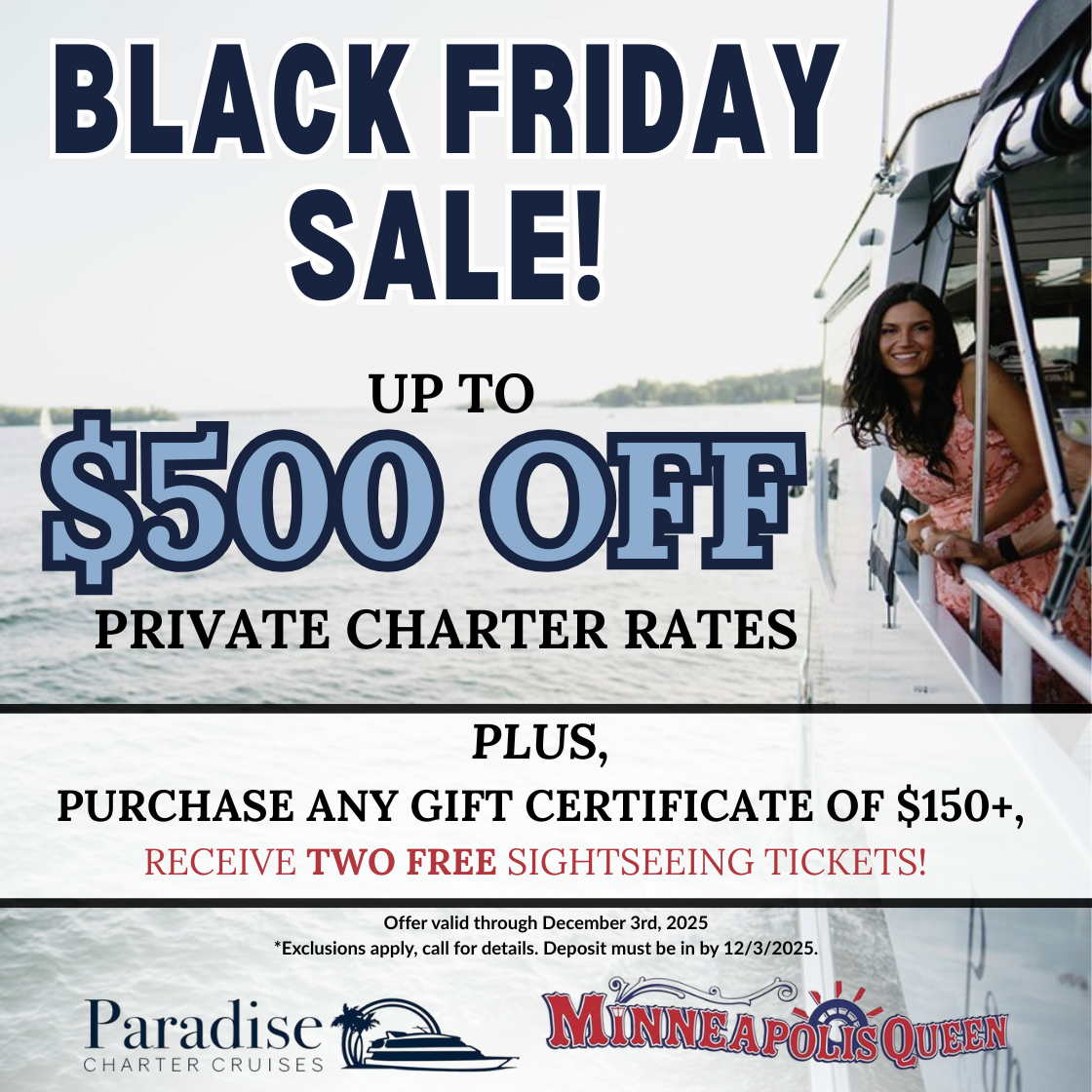 Thank you for considering Paradise Charter Cruises & The Minneapolis Queen for your event. Please provide your contact information and specific needs below. Our team will respond promptly. We look forward to working with you!