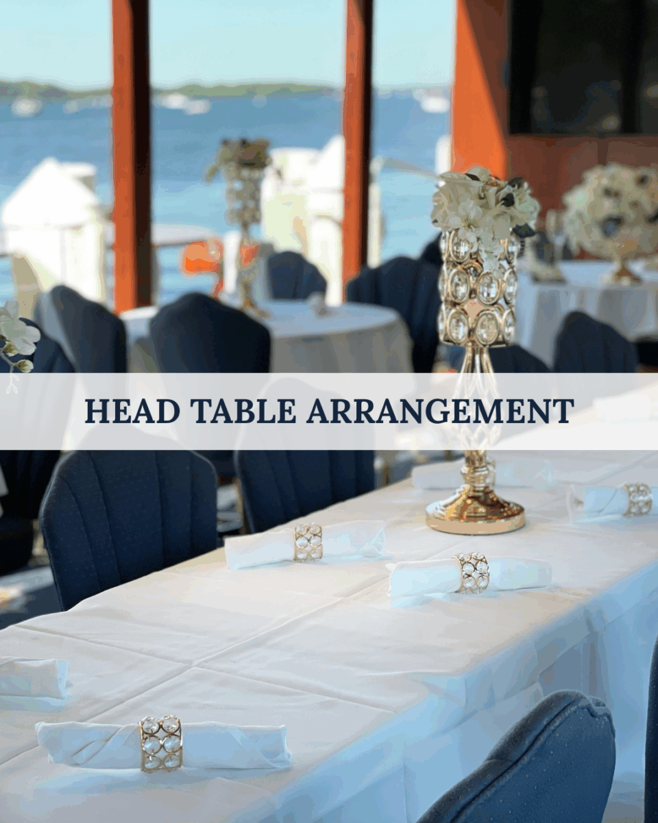 Includes cocktail glasses, wine glasses, champagne flutes, and water goblets on the tables.